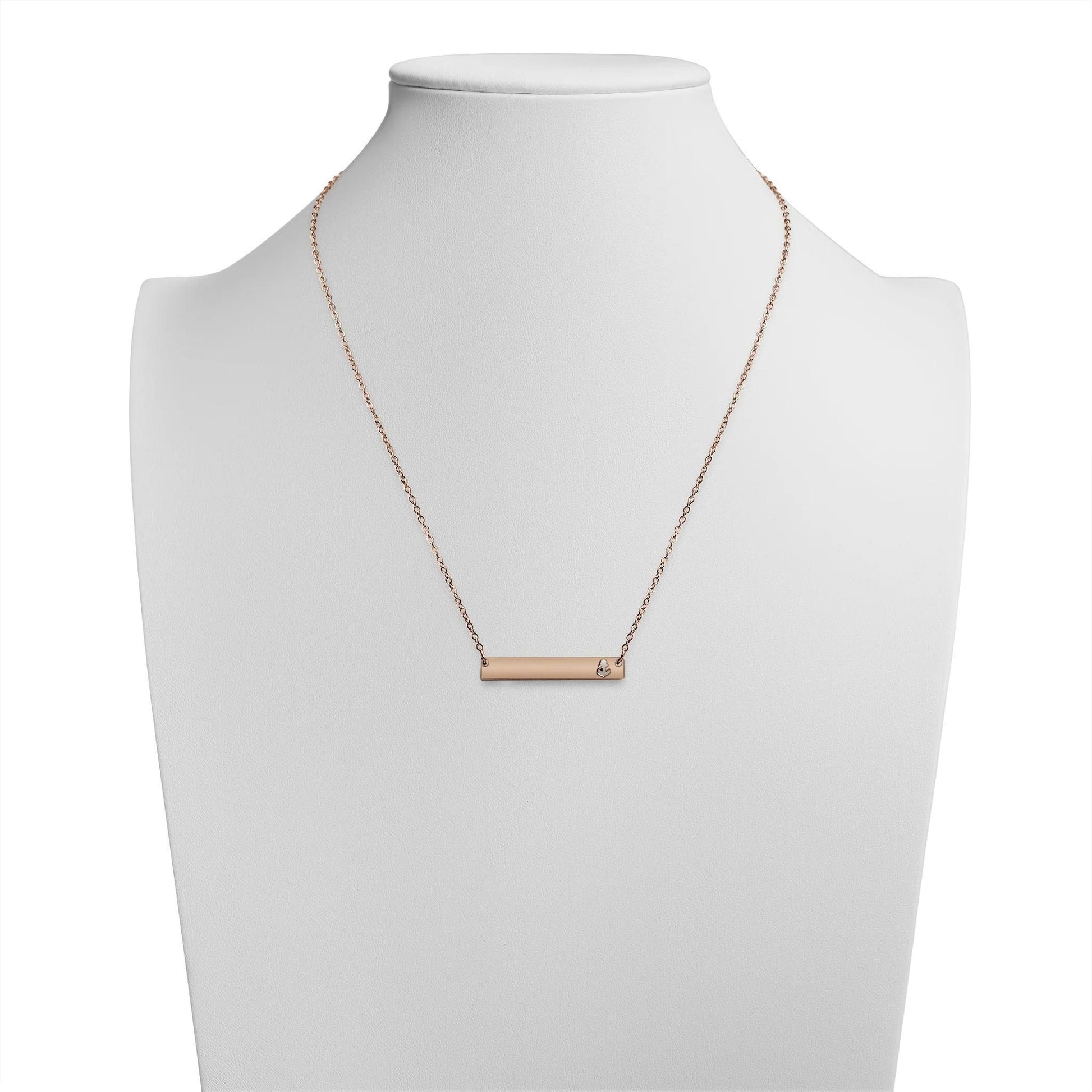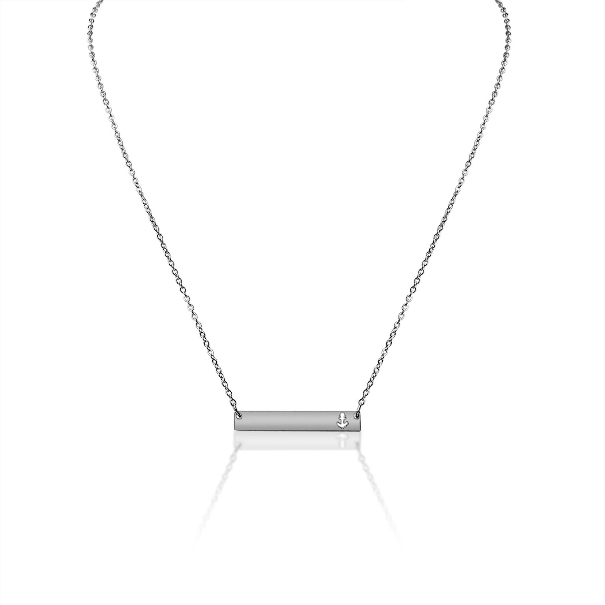 Add some sea-worthy style to your look with this Anchor Cutout Horizontal Bar Stainless Steel Necklace! Its shiny finish adds a touch of sleekness, while the option to personalize with a name, phrase, or handwritten message makes it truly one-of-a-kind. A perfect gift for anchor enthusiasts and ocean lovers!