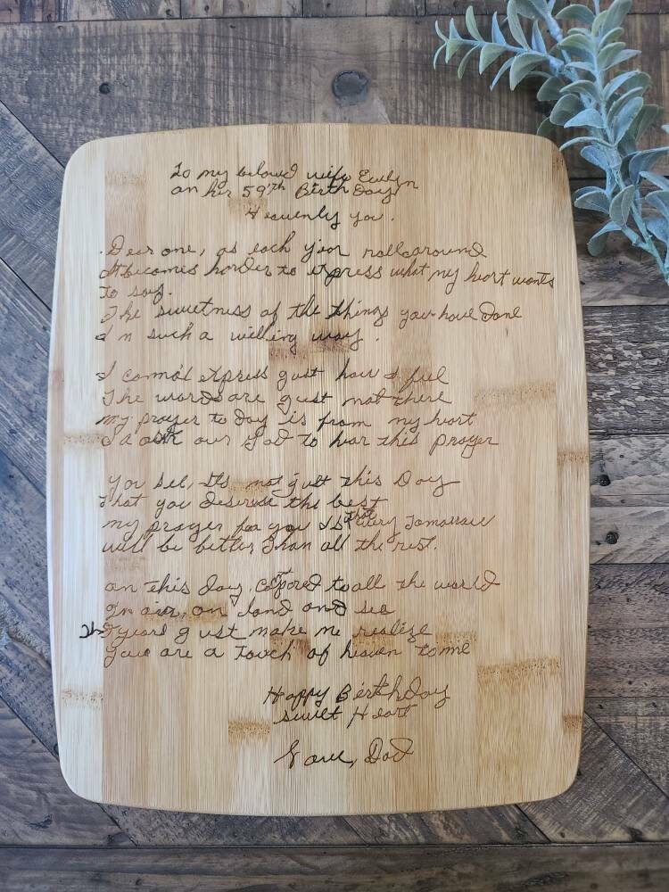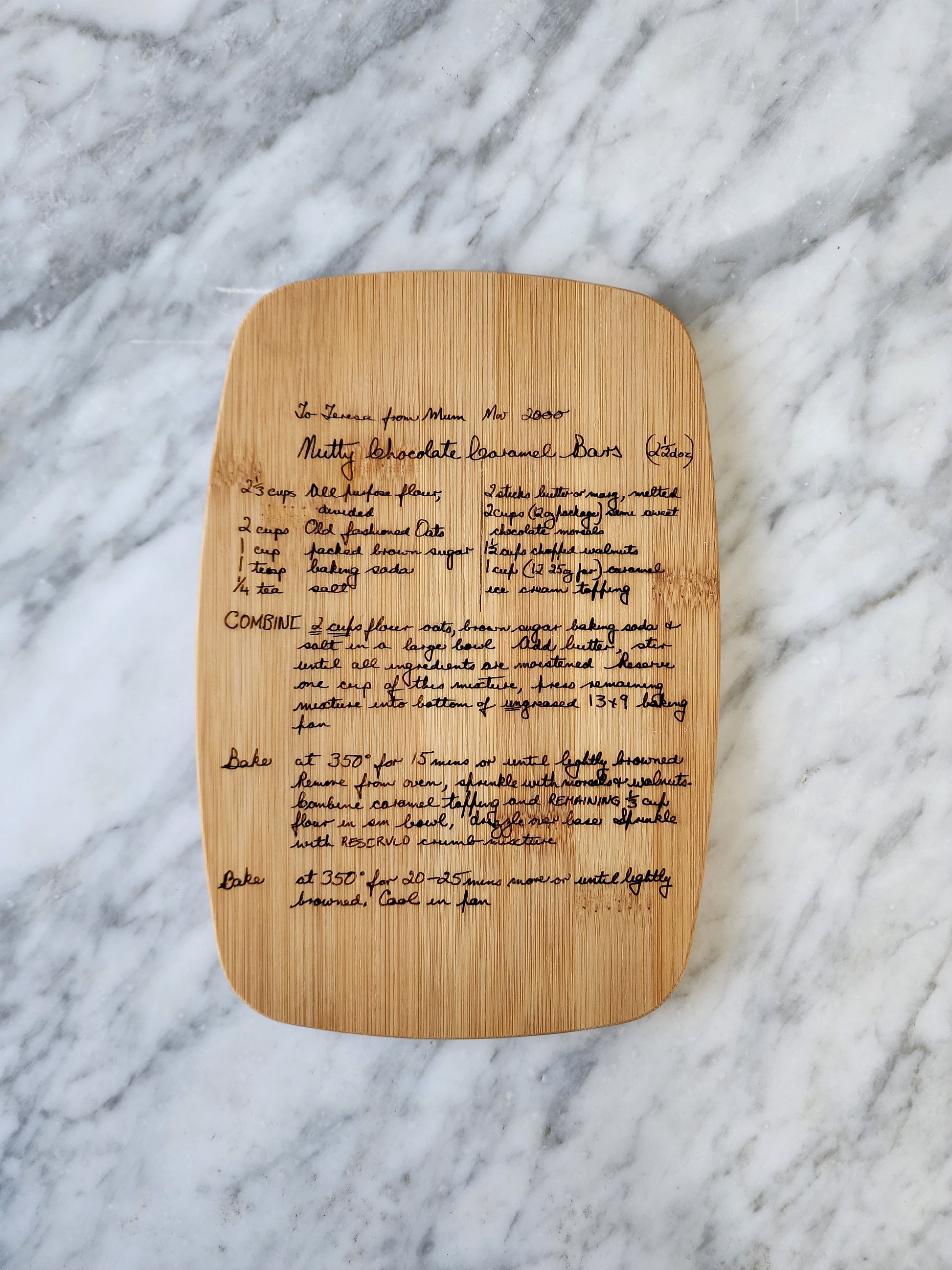 Turn a special handwritten recipe into a cherished keepsake with a personalized cutting board. Your design doesn't have to be a recipe or handwritten, it could be a note, poem, prayer, music, drawing or anything you want! This is a great item for yourself or as a gift to a loved one! Imagine digging up Grandma's old secret family recipe and getting a cutting board engraved for your mom for mother's day - I guarantee happy tears! These are also great gifts for friends, retirement, birthday's, or just because.