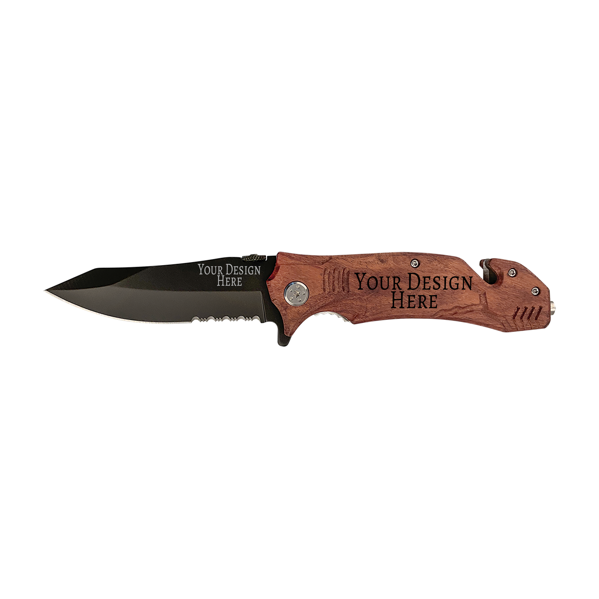 Customize your own rescue knife! Both the blade and handle can be personalized with your custom phrase or logo. The steel blade engraves gray. The black, blue and red handles are anodized aluminum and will engrave white. Wood handle engraves to a dark brown.