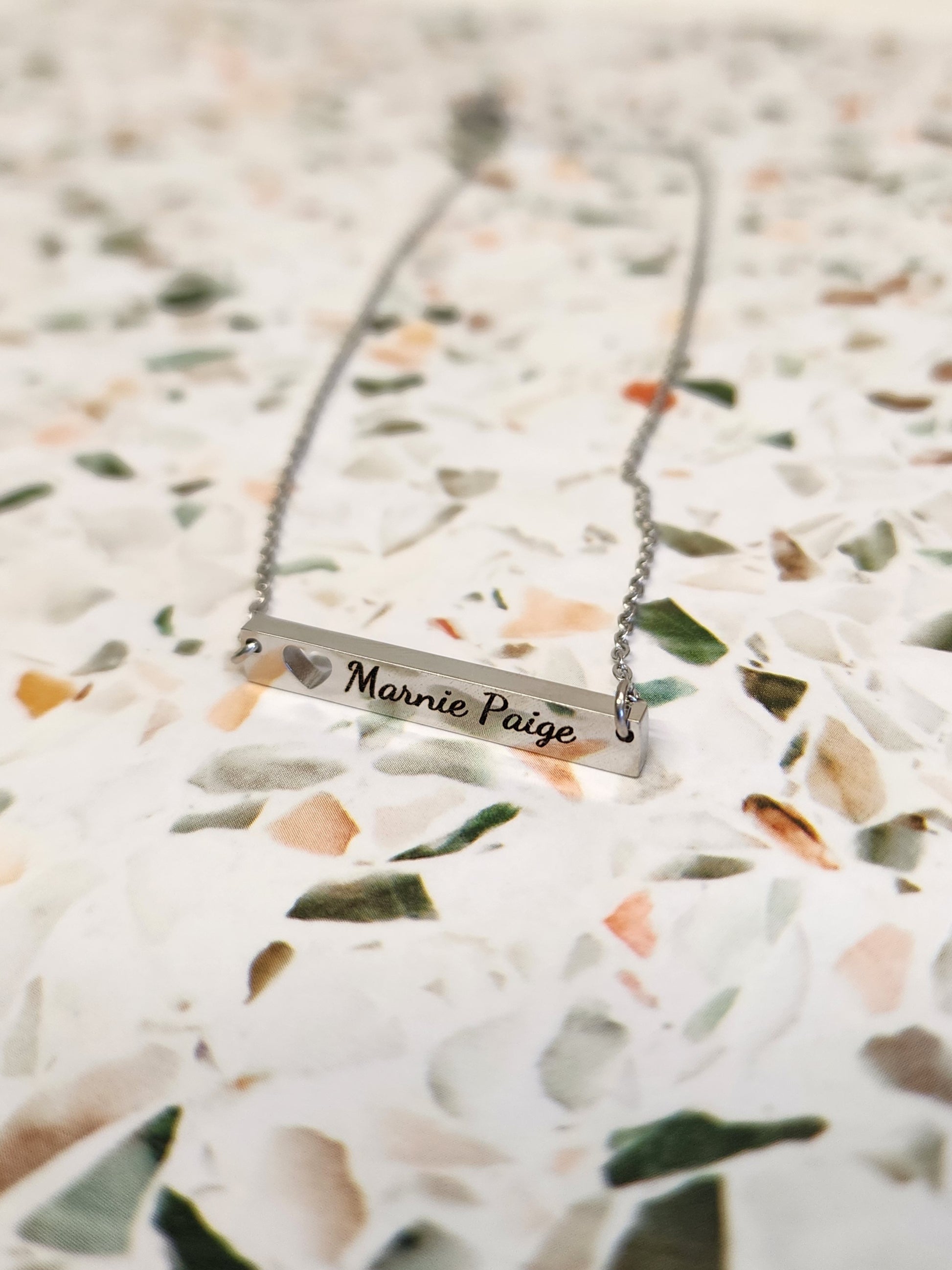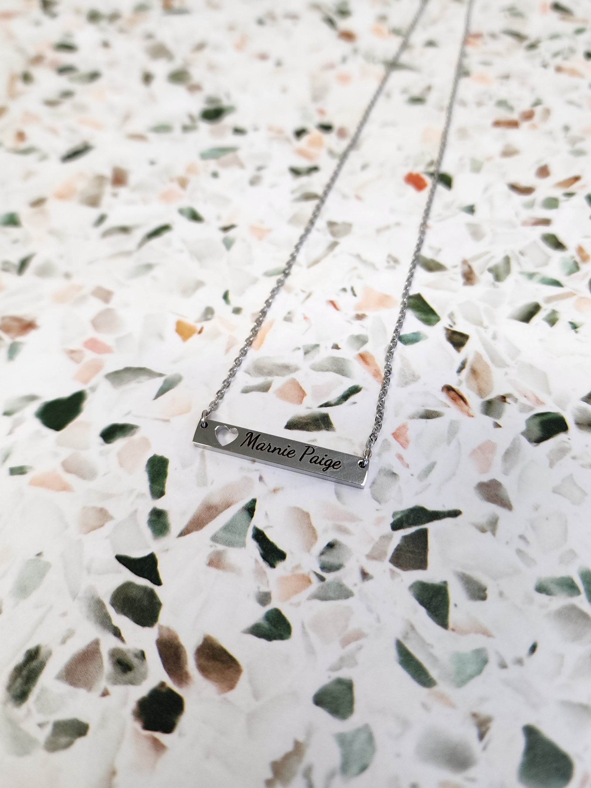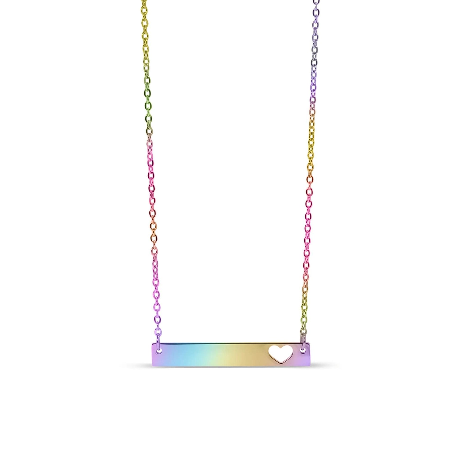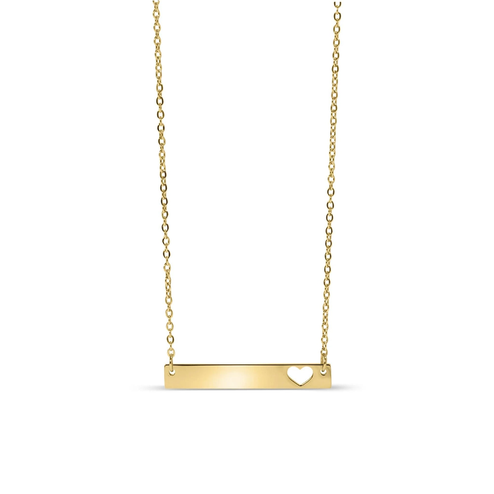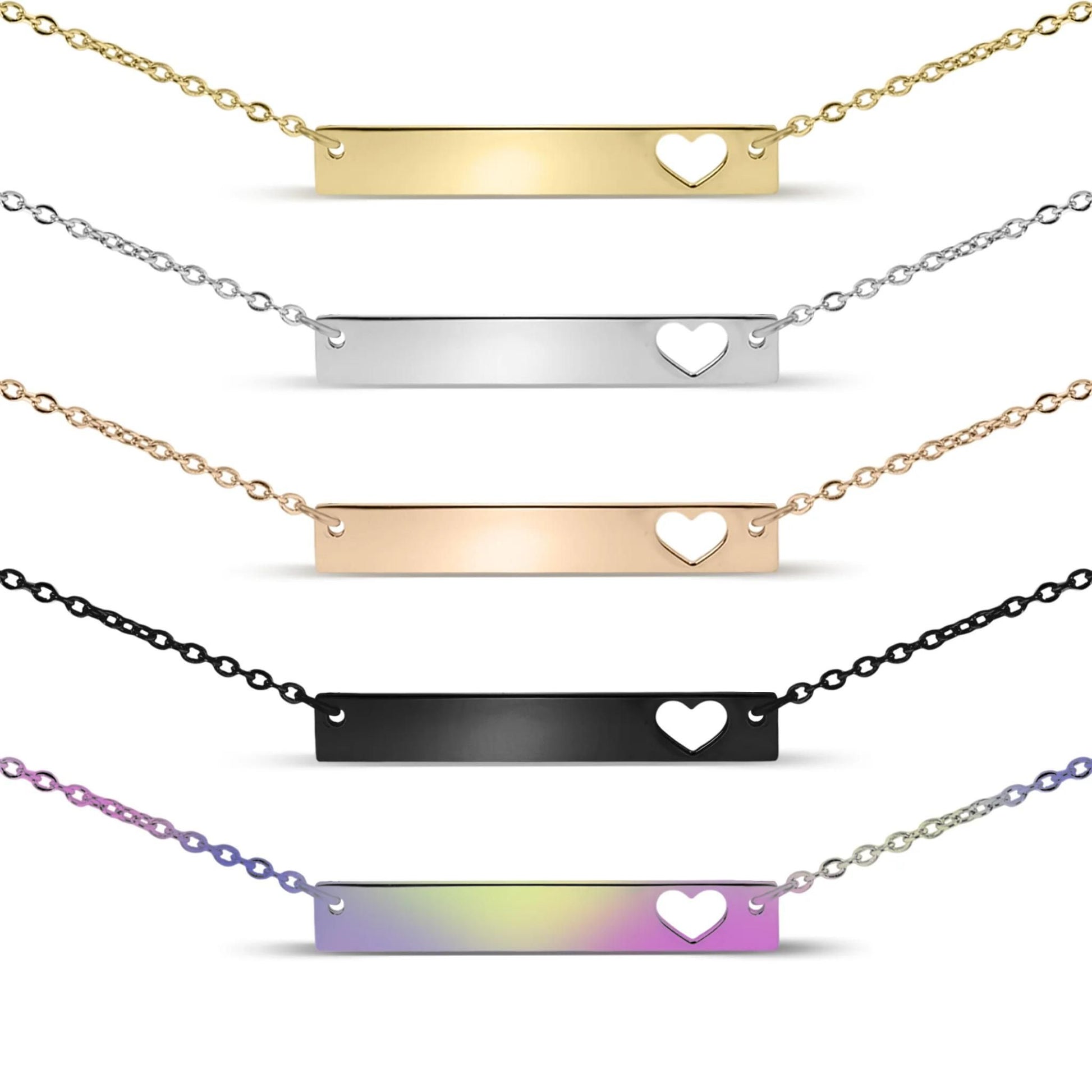 Add a touch of love to any outfit with the Heart Cutout Bar Necklace. This one-of-a-kind piece features a shiny bar pendant with a cheeky cutout heart design. Personalize it with a name, phrase, or handwritten message for a truly unique gift for that special someone.