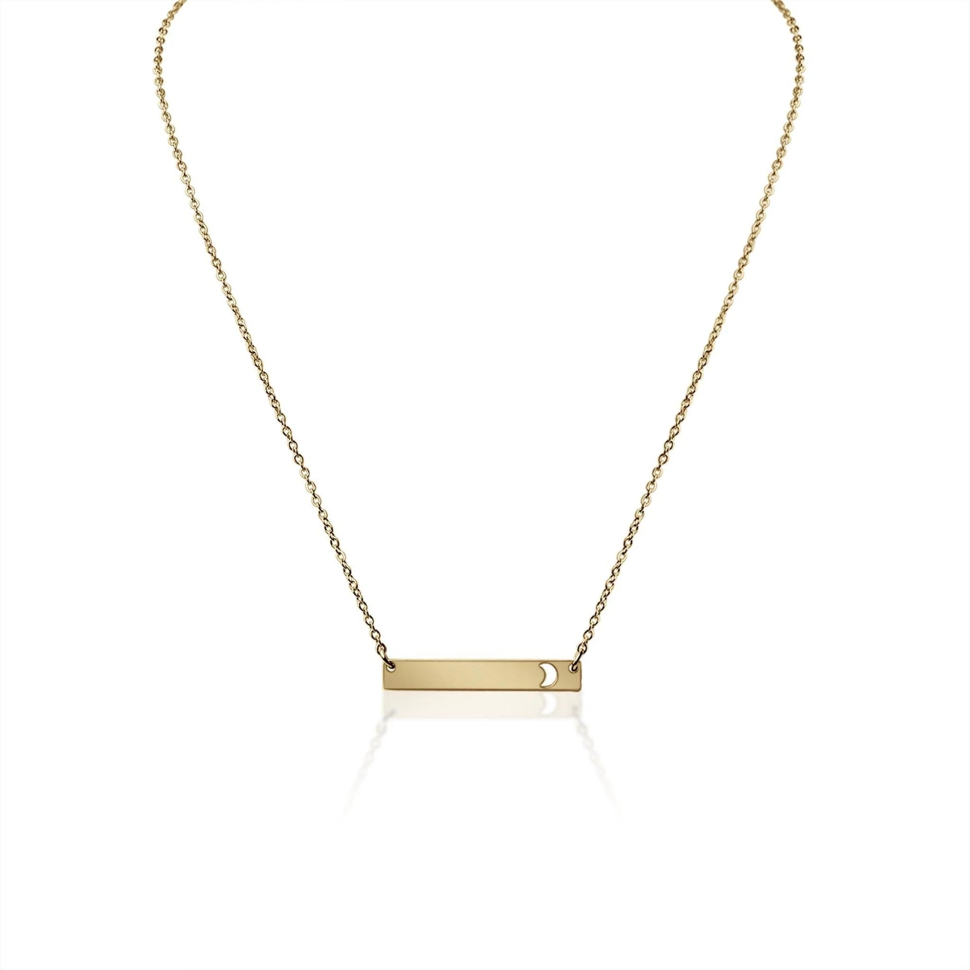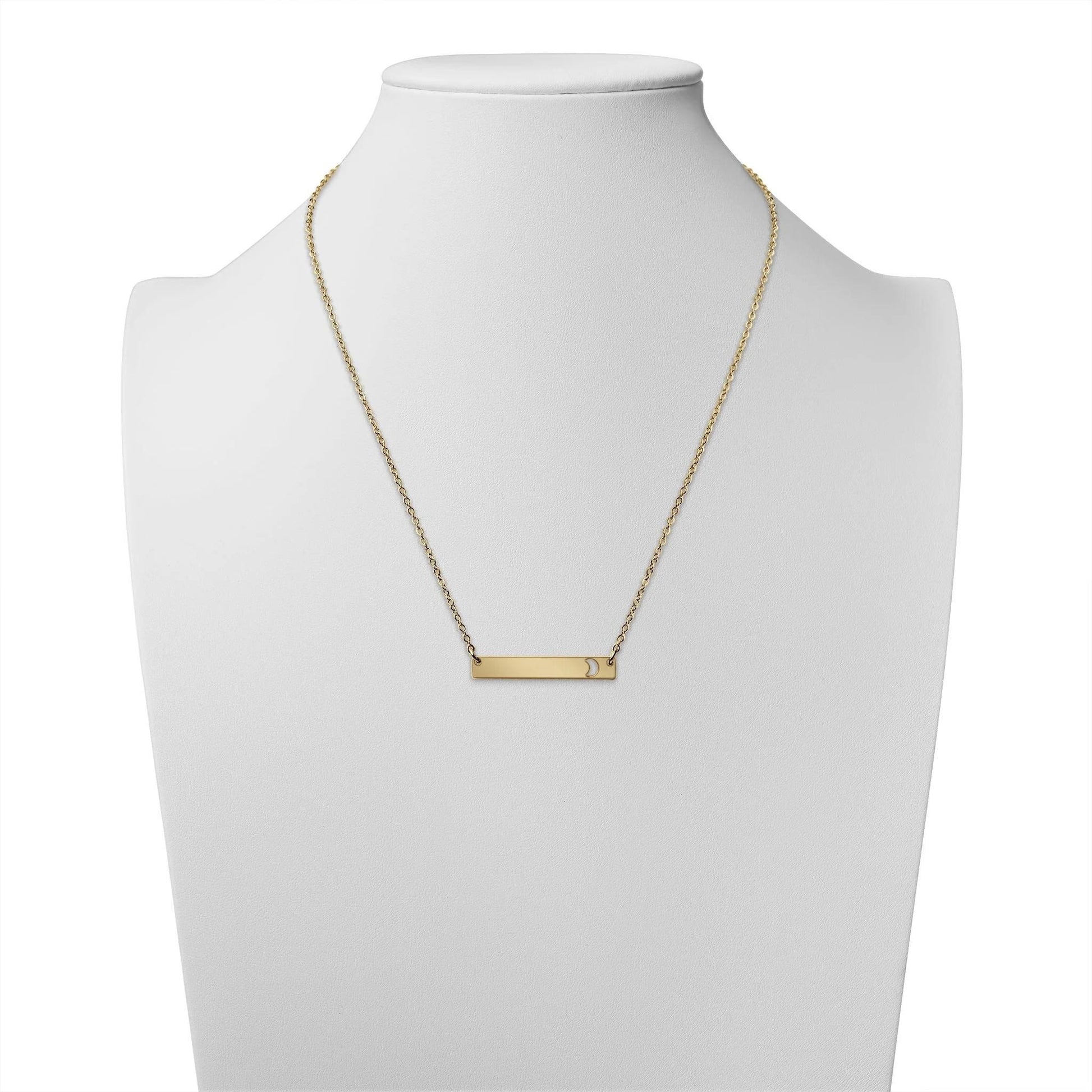 For those who love all things lunar, this Horizontal Moon Cutout Stainless Steel Bar Necklace is the perfect accessory. Its sleek design, polished shine, and moon cutout make it a treasured addition to any wardrobe. Get creative and personalize it with your own name, phrase, or even a handwritten message - the possibilities are endless!