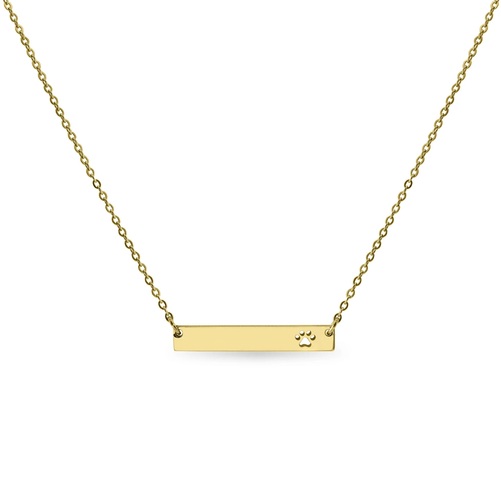Turn heads with this 18K PVD Coated Stainless Steel Bar Necklace features a cute paw print cutout! Its shiny finish will add some sleekness to your style, and you can make it truly one-of-a-kind by personalizing it with a name, phrase, or even a handwritten message. It is an excellent gift for pet owners and animal lovers alike!